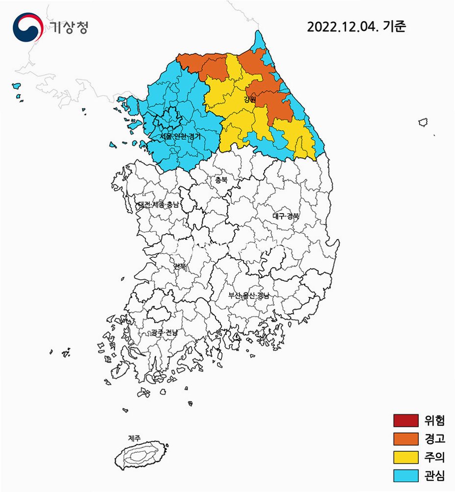 서해안에 많은 눈이 내리는 것과는 대조적으로, 동해안 지역에는 건조경보가 발효 중입니다. 대기가 매우 건조하여 작은 불씨에도 대형 산불로 이어질 수 있으므로, 산불 예방에 각별한 주의가 필요합니다. 또한, 내륙 지역은 내일 강한 바람이 불 것으로 예상됩니다. 강풍으로 인해 시설물 피해가 발생하지 않도록, 안전 점검을 실시하고, 야외 활동 시에는 안전에 유의해야 합니다.
