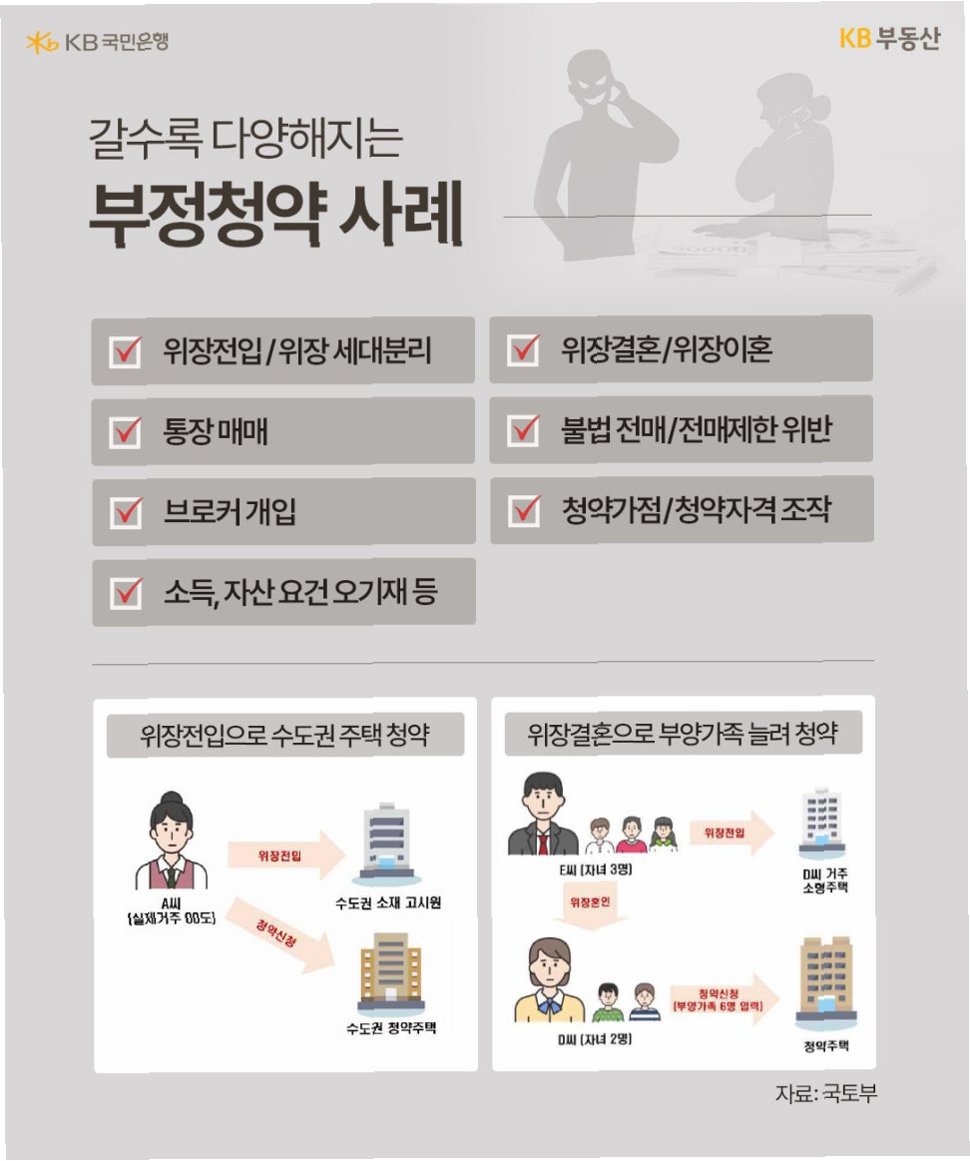 A.높은 청약 경쟁률과 시세 차익을 노리고, 불법적인 방법으로 청약 자격을 얻으려는 시도가 늘어나기 때문입니다. 위장전입, 위장이혼, 청약통장 매매 등 다양한 수법이 동원되고 있습니다.