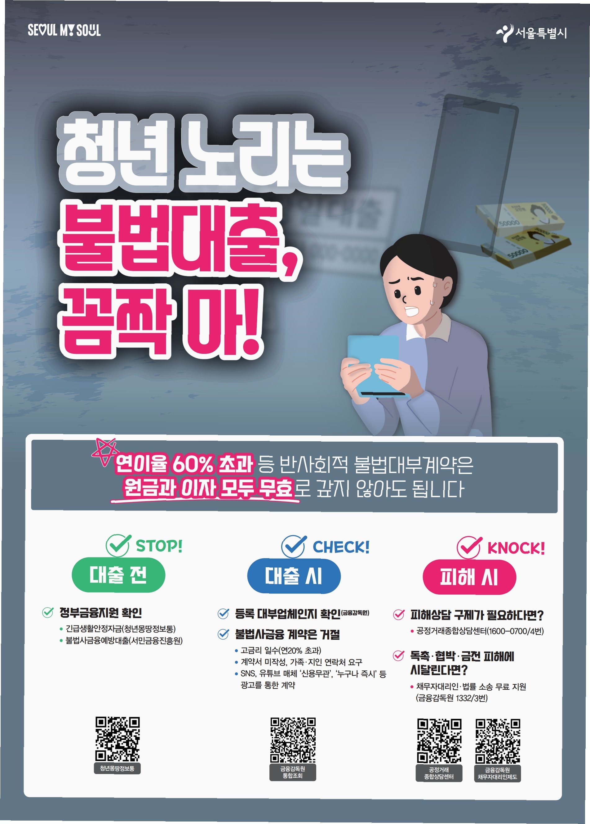 만약 불법 사금융 피해를 입었다면, 즉시 금융감독원(☎1332)에 신고하여 도움을 받으세요. 과다 채무로 어려움을 겪고 있다면, 서민금융진흥원(☎1397) 또는 신용회복위원회(☎1600-5500)를 통해 채무 조정 및 재정 상담을 받을 수 있습니다. 또한, 연 이자율 60% 초과 대부 계약은 원금과 이자 모두 무효이므로, 적극적으로 권리를 행사해야 합니다. 여러분의 어려움을 함께 나누고, 더 나은 내일을 만들어갈 수 있도록 정부는 최선을 다해 지원할 것입니다.