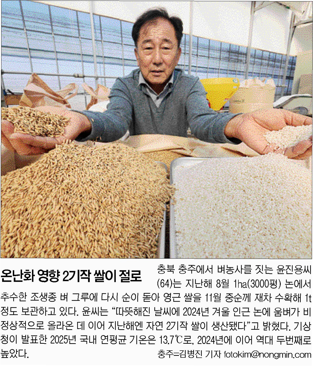 충북 충주에서 벼농사를 짓는 윤진용씨(64)는 지난해 8월 1㏊(3000평) 논에서 추수한 조생종 벼 그루에 다시 순이 돋아 영근 쌀을 11월 중순께 재차 수확해 1t 정도 보관하고 있다. 윤씨는 “따뜻해진 날씨에 2024년 겨울 인근 논에 움벼가 비정상적으로 올라온 데 이어 지난해엔 자연 2기작 쌀이 생산됐다”고 밝혔다.