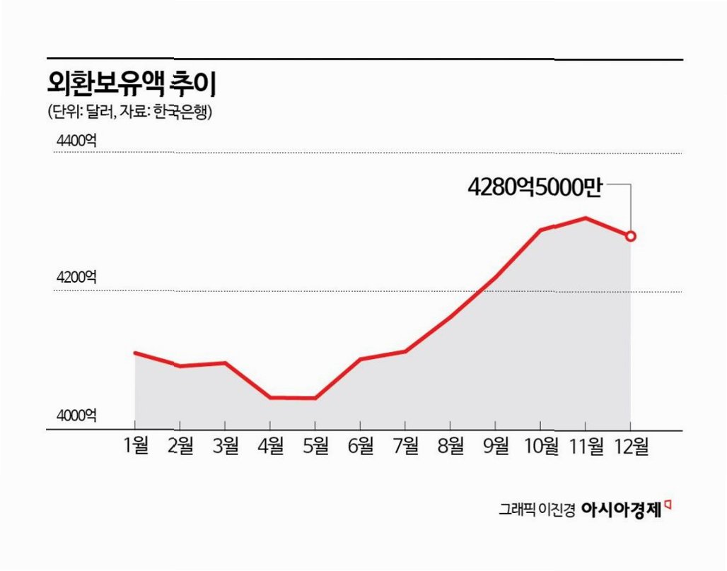 5월 말, 약 5년 만에 최저 수준(4046억 달러)까지 외환보유액이 감소했었습니다. 이후 11월까지 6개월 연속 증가하며 회복세를 보였지만, 12월에는 소폭 감소했습니다. 이러한 변동성은 경제 상황과 환율 변동에 따라 불가피하게 발생하며, 정부는 이러한 변화에 맞춰 적절한 정책을 시행하고 있습니다. 외환보유액의 변동 추이를 지속적으로 모니터링하고, 경제 상황에 맞는 전략을 수립하는 것이 중요합니다.