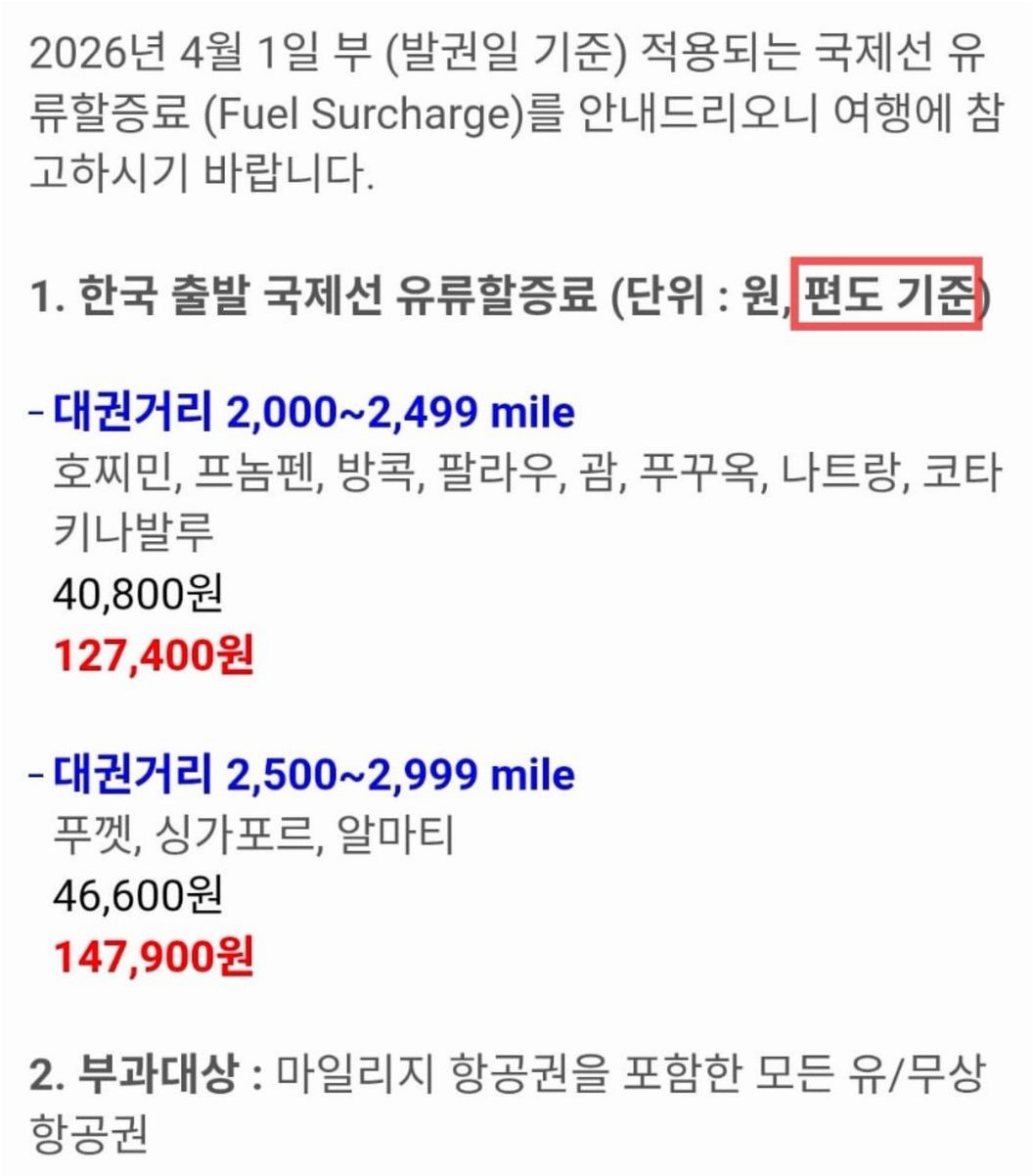 국제 유가 상승으로 인해 다음 달 국제선 유류할증료가 3배까지 치솟으면서 여행객들의 부담이 커지고 있습니다. 기존 6단계였던 유류할증료가 4월부터는 18단계로 상향 조정되어, 왕복 기준 최소 8만 4천 원에서 최대 60만 6천 원까지 추가 비용이 발생합니다. 이는 기존 대비 약 3배 인상된 금액으로, 특히 후쿠오카와 같은 단거리 노선도 큰 폭의 인상이 불가피합니다.