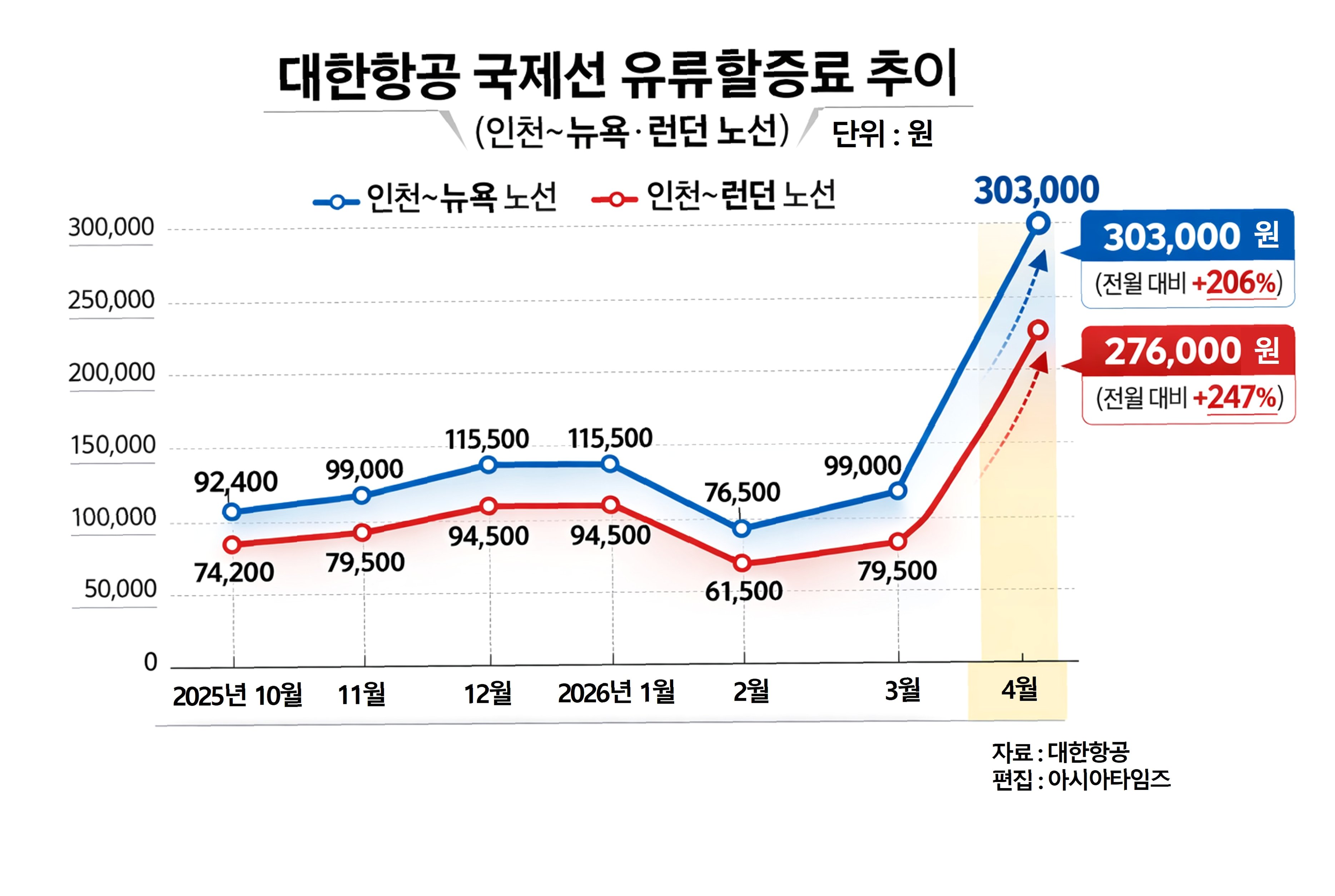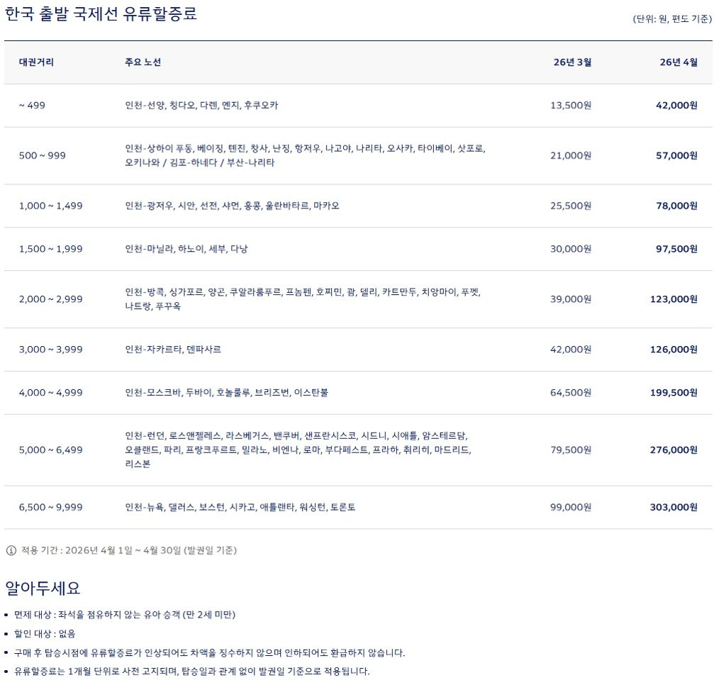 항공사별 유류할증료 인상 현황