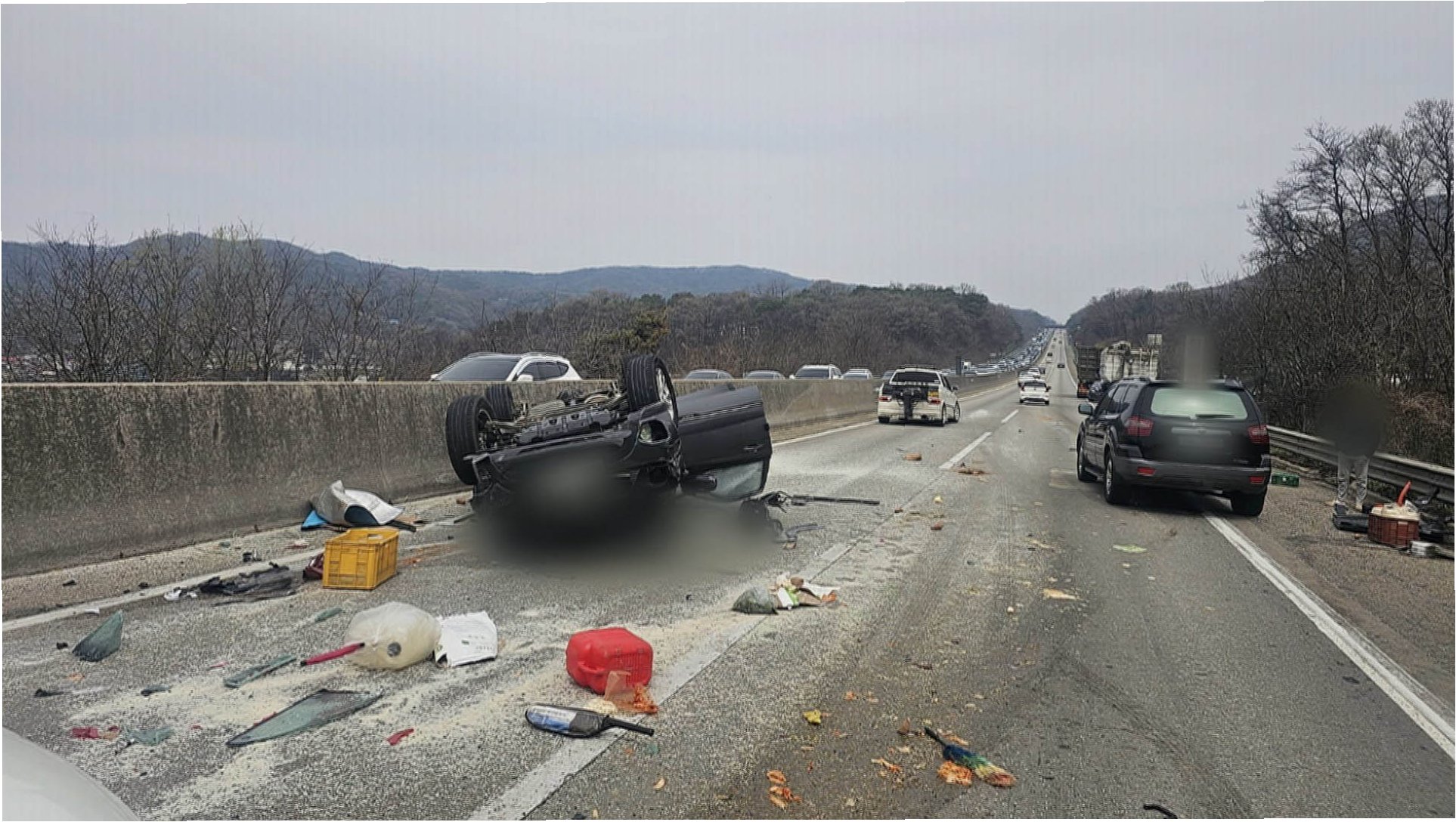 사고 현장의 아찔함: 기름 유출과 도로 통제