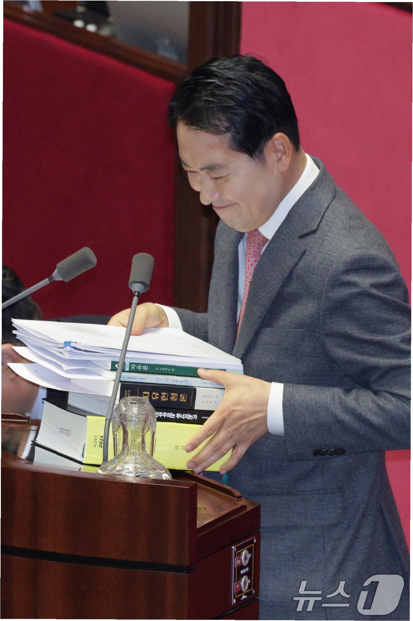 홀로 24시간을 모두 쓰면서 역대 필리버스터 최장 기록 17시간 12분도 넉넉하게 갈아치웠습니다. 새벽녘 필리버스터 최장 기록을 경신했단 소식에 국민의힘 의원들은 아침 일찍 본회의장으로 달려가 힘을 보탰고, 토론 종결 뒤에도 연단에서 내려오는 장 대표를 기립박수로 맞이했습니다.