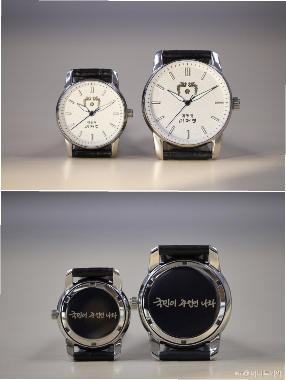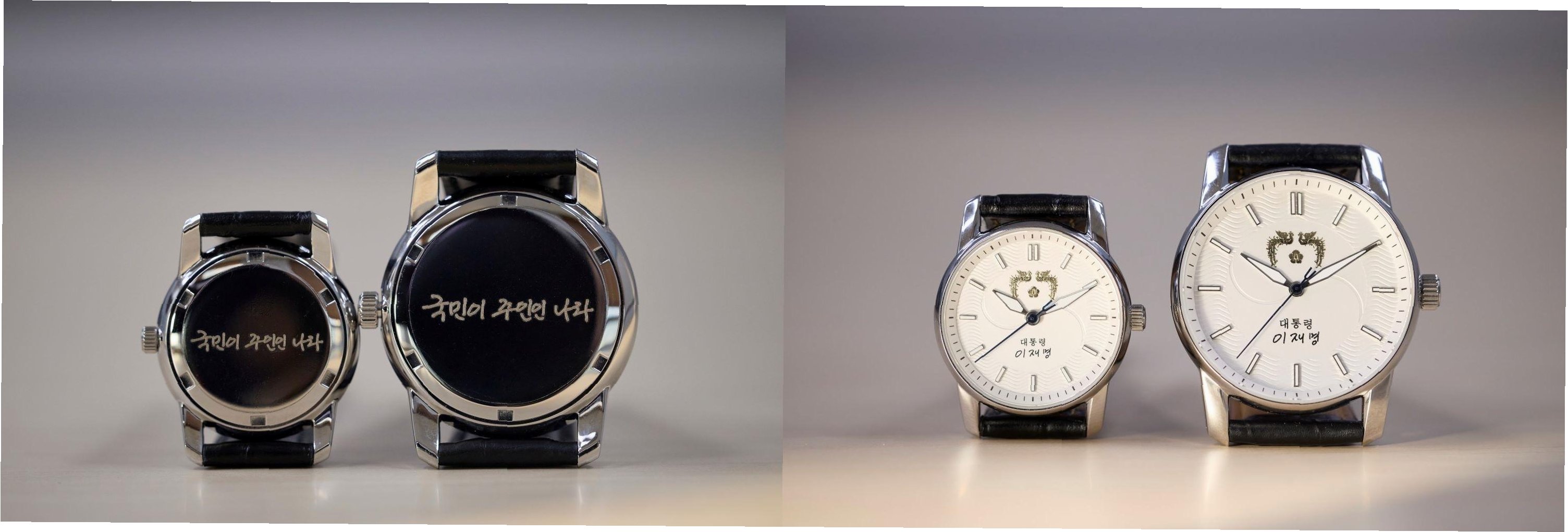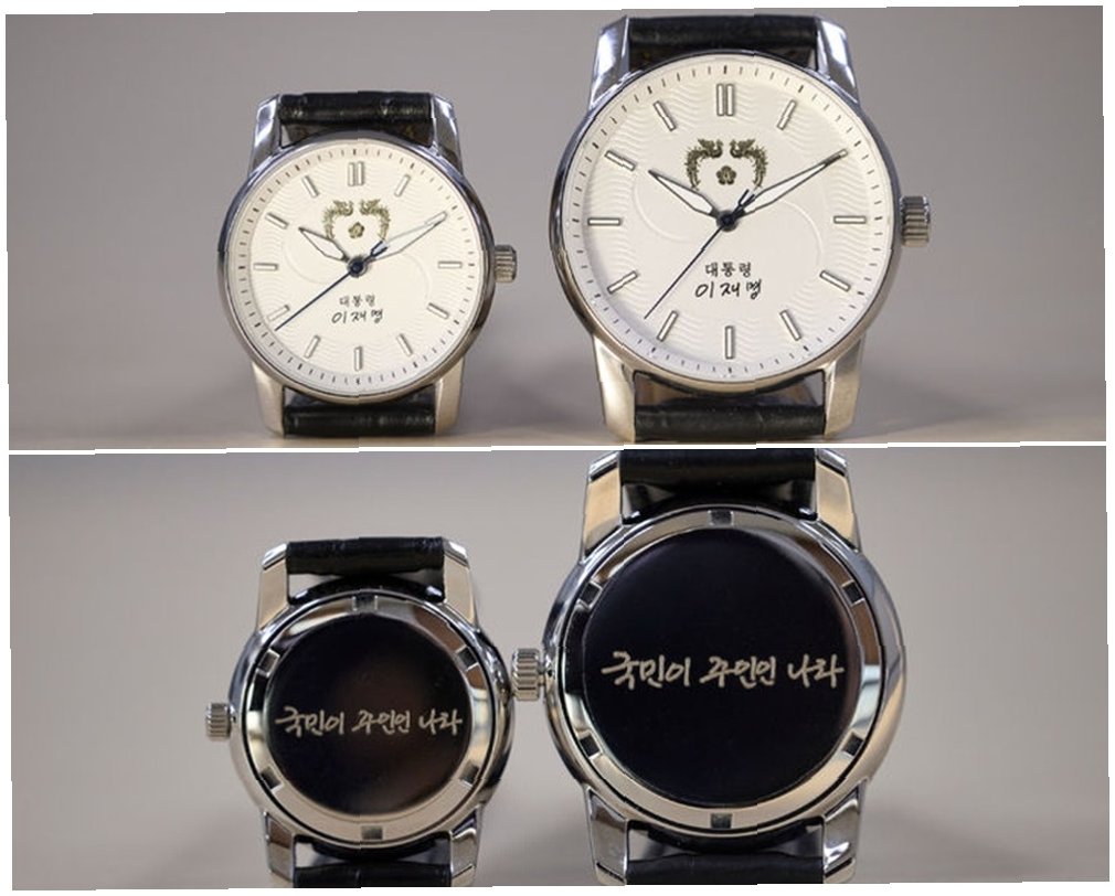 A.시계 앞면에는 대통령 휘장, 서명, 태극 문양이, 뒷면에는 '국민이 주인인 나라'라는 문구가 새겨져 있습니다.