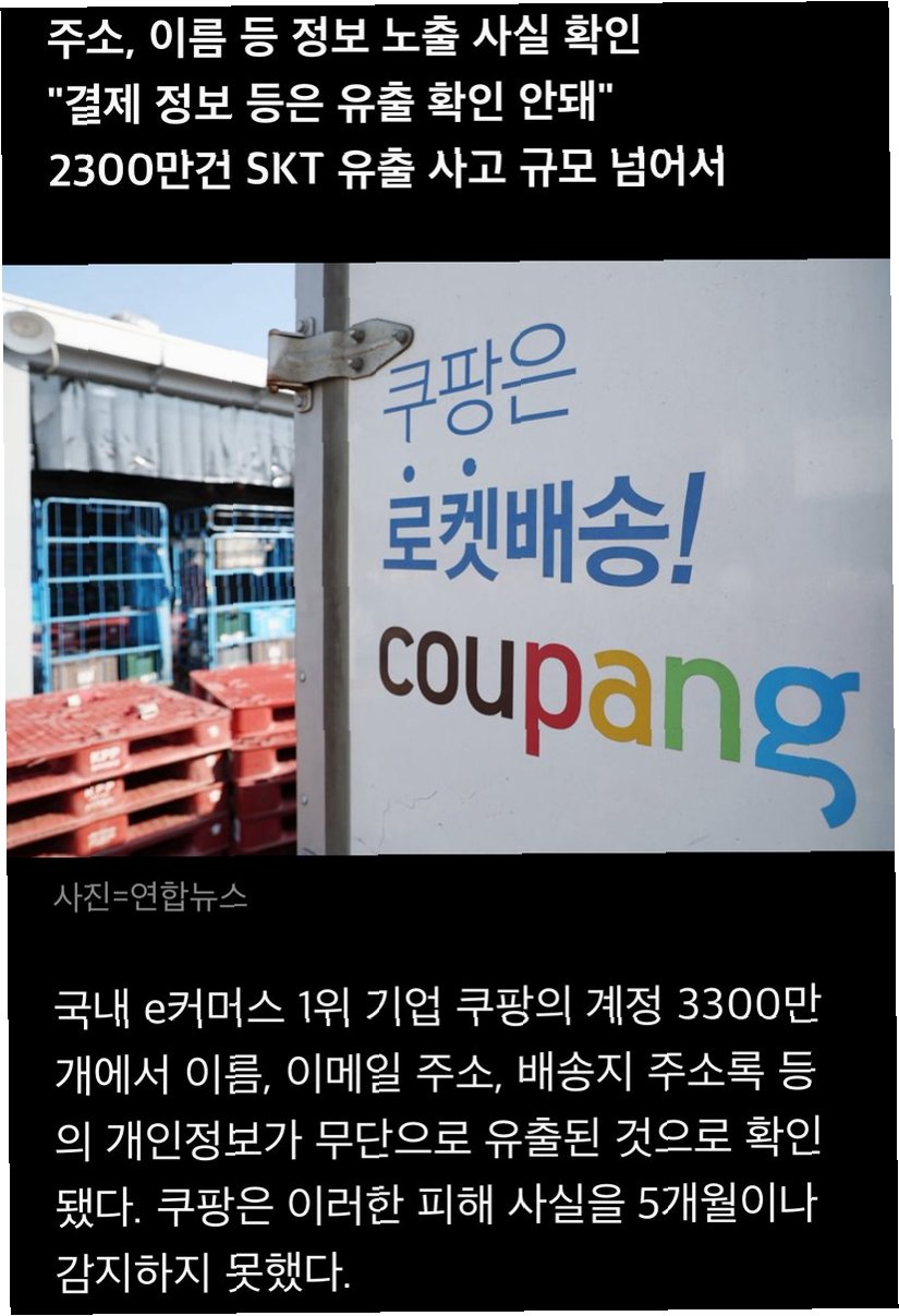 쿠팡에서 고객들의 이름과 이메일, 배송지 등 개인정보가 유출되는 사고가 발생했습니다. 쿠팡은 고객 계정 3370만개가 무단으로 노출된 것으로 확인됐다고 밝혔습니다. 이는 쿠팡의 3분기 활성 고객 수보다 1000만 개 가까이 많은 수치로, 사실상 쿠팡의 모든 고객 개인정보가 노출된 것으로 보입니다.