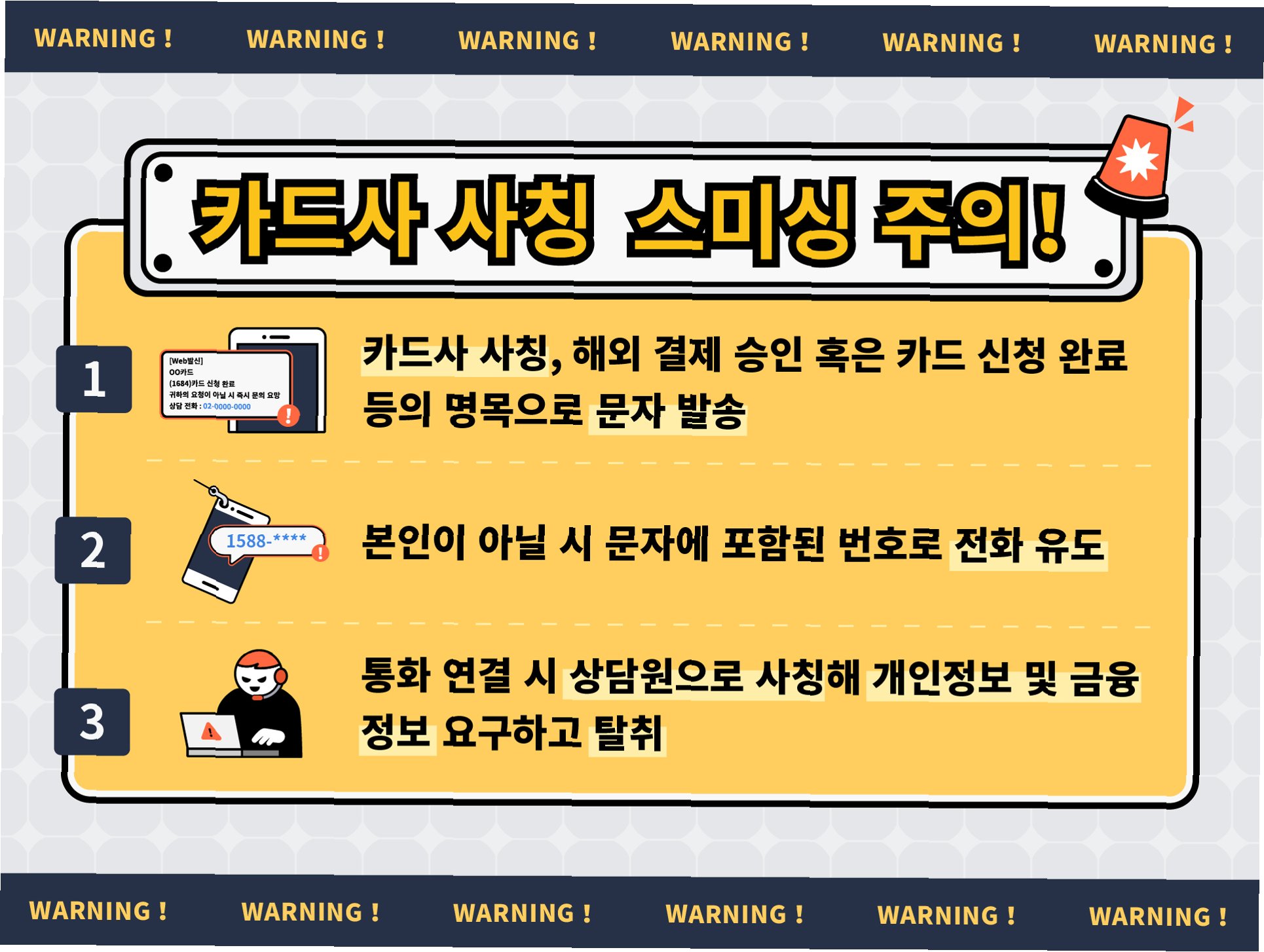 피싱범들은 주로 '본인 명의로 신용카드가 발급되었다'는 내용으로 접근하여 피해자를 속입니다. 만약 본인이 신용카드를 신청한 적이 없다고 하면, '쿠팡 관련 개인정보 유출로 인해 신청하지 않은 카드가 발급되었을 수 있다'고 말하며 불안감을 조성합니다. 그리고 '고객센터에 확인해봐야 한다'는 핑계로 가짜 고객센터 전화번호를 알려주며, 피해자가 직접 전화를 걸도록 유도합니다. 이 과정에서 피해자는 자신도 모르게 보이스피싱 범죄의 희생양이 될 수 있습니다.