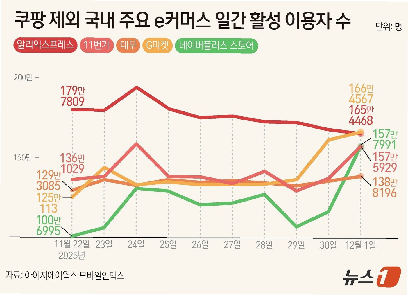 A.G마켓, 11번가, 네이버플러스스토어 등 경쟁 업체들의 이용자 수가 증가했습니다.