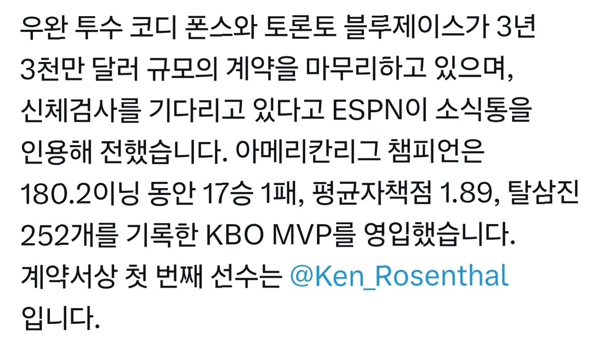 2025시즌 KBO 리그를 평정했던 한화 이글스의 에이스 코디 폰세가 메이저리그에 전격 복귀한다. 행선지는 한화에서 한솥밥을 먹었던 류현진의 친정팀이자 올 시즌 월드시리즈(WS) 준우승팀, 바로 토론토 블루제이스다. 미국 프로야구 메이저리그(MLB) 공식 홈페이지인 MLB.com과 미국 매체 ESPN 등은 3일(한국 시각) "폰세가 토론토와 3년 3000만 달러(한화 약 440억원)에 계약을 맺었다"고 보도했다. 사실상 메디컬 테스트 등의 절차만 끝나면 토론토 구단의 공식 발표가 있을 전망이다.