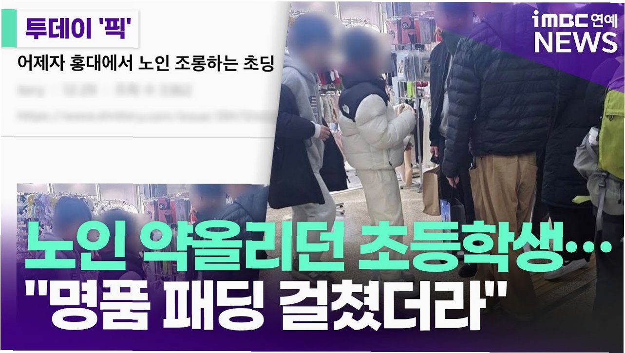 A.홍대 인근에서 고가 패딩을 입은 초등학생들이 연두색 배낭을 멘 노인을 조롱하며 도망치고 쫓는 행위를 반복했습니다. 개그맨 김영민 씨가 목격담을 온라인에 공개하며 알려졌습니다.