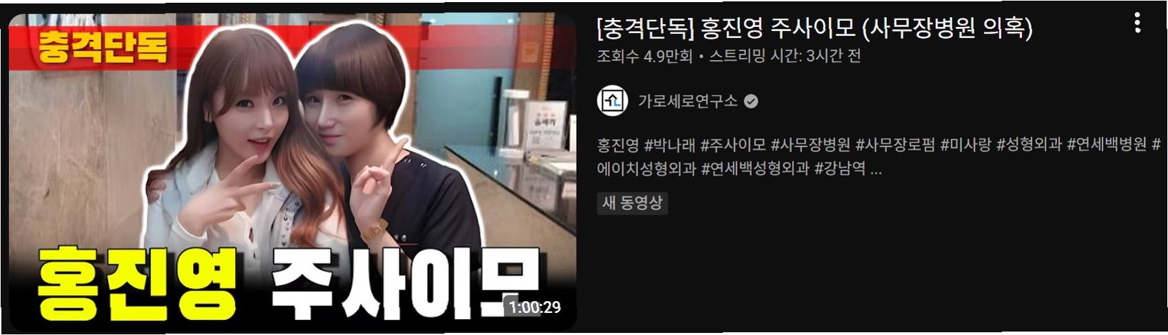 가수 홍진영 측이 박나래, 샤이니 키 등이 연루된 '주사이모'와의 친분 의혹에 대해 즉각 일축했다. 소속사 아이엠에이치엔터테인먼트 측은 23일, 홍진영과 '주사이모'와의 친분 의혹에 대한 공식 입장문을 발표했다. 앞서 유튜브 채널 '가로세로연구소'에서 홍진영과 '주사이모' 이 모 씨가 과거 찍은 사진을 공개하며 의혹을 제기했다.