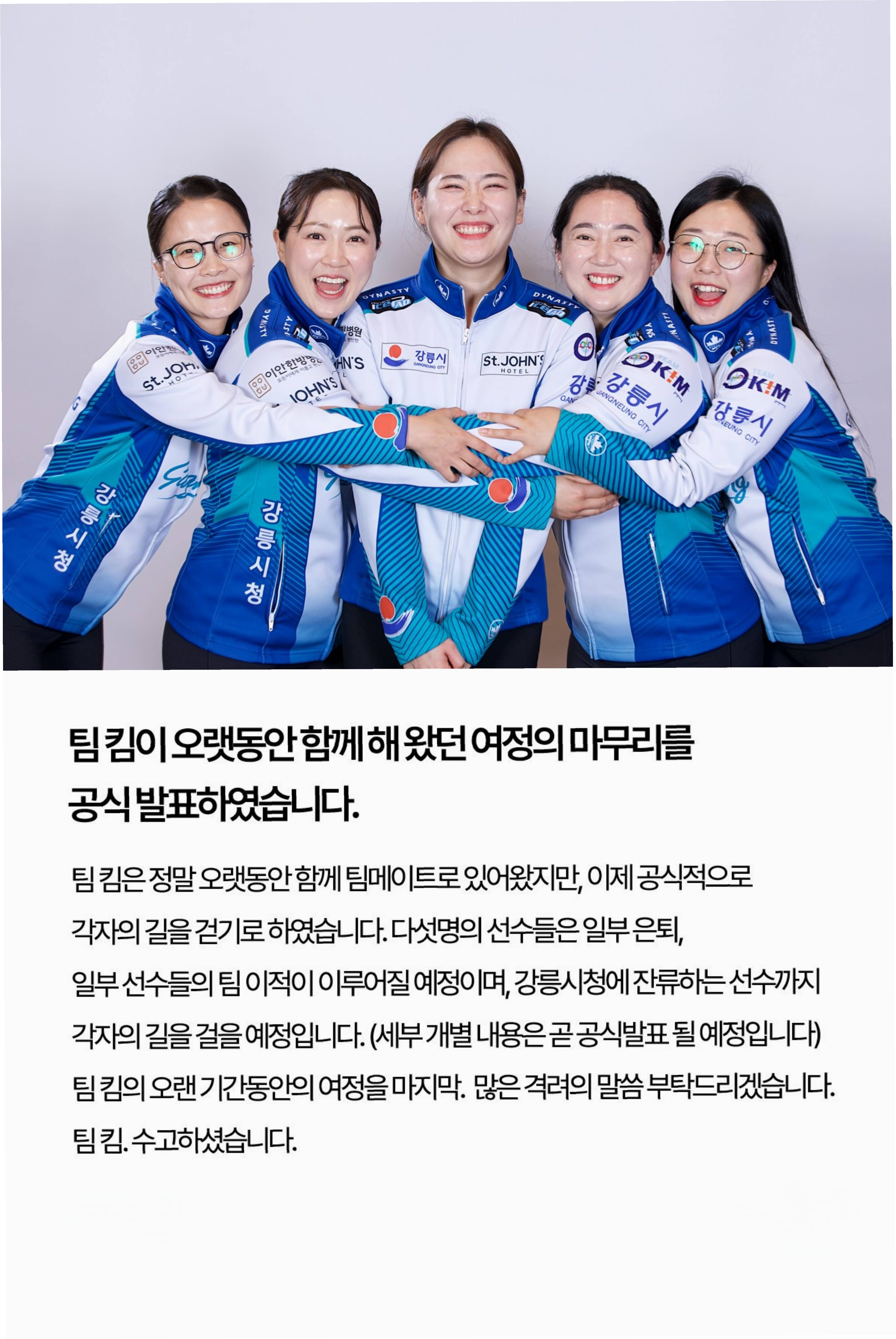 길게는 17년, 짧게는 12년이라는 시간 동안 팀킴은 서로를 누구보다 믿고 의지하며 여기까지 달려왔습니다. 2009년 처음 뭉쳤던 팀은 2026년을 끝으로 '환 팀'으로서의 여정을 공식적으로 마무리하게 되었습니다. 팀킴은 해체 소식을 전하며 "이제 한 팀으로서의 시간은 여기서 멈추지만, 각자의 자리에서 새롭게 도전하며 또 다른 길을 걸어가고자 한다. 비록 다른 길을 걷게 되었지만 서로를 향한 응원은 변함없을 것"이라며 아쉬움과 희망을 동시에 전했습니다. 함께한 시간은 소중한 기억으로 남을 것이며, 어디에서든 서로를 응원할 것이라는 따뜻한 메시지를 남겼습니다.