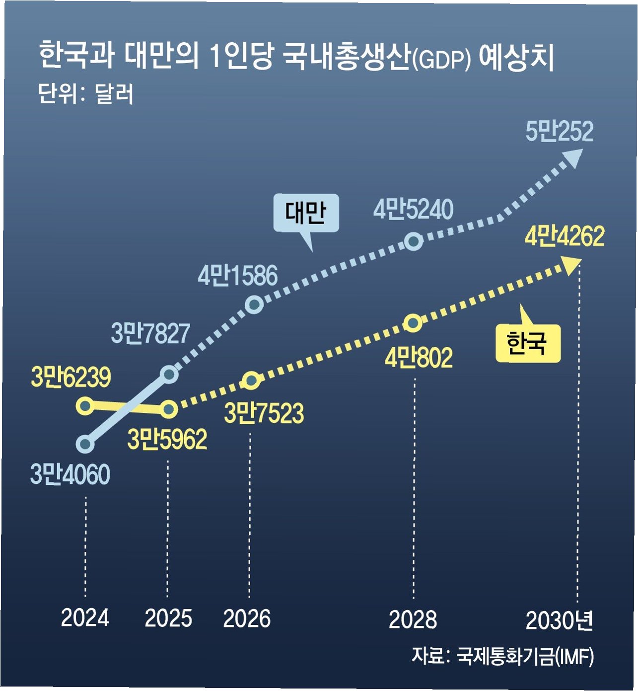 한국은 저성장과 고환율의 영향으로 1인당 GDP가 감소한 반면, 대만은 반도체 수출 호조에 힘입어 한국을 추월할 것으로 예상됩니다. 대만은 4만 달러 시대를 먼저 열 것이라는 전망이 나오는 가운데, 한국 경제는 재도약을 위한 노력이 절실합니다.