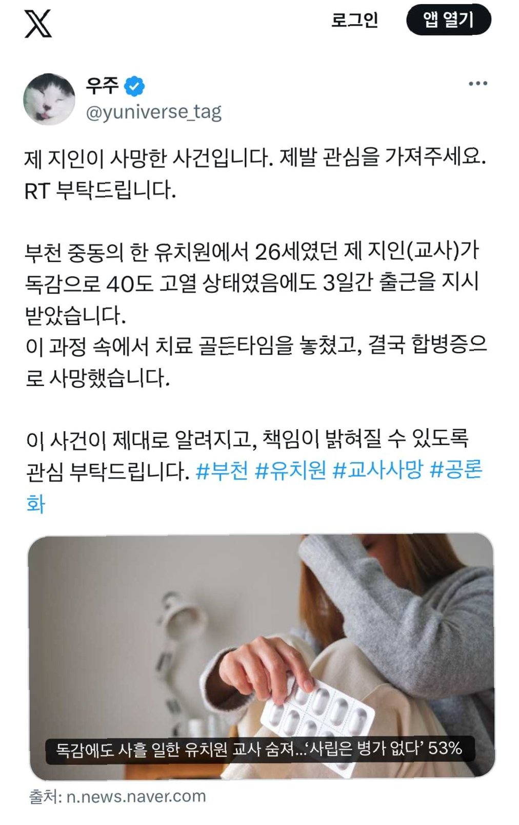 열악한 근무 환경과 인력난으로 인해 아파도 제대로 쉬지 못하고 결국 목숨을 잃은 유치원 교사의 비극은 우리 사회에 큰 충격을 안겨주었습니다. 교사의 건강권은 교육의 질과 아이들의 안전에 직결되는 문제임을 인식하고, 실효성 있는 대체 인력 시스템 마련과 병가 사용 보장 등 제도 개선이 시급히 이루어져야 합니다. 더 이상 희생이 반복되지 않도록 우리 모두의 관심과 노력이 필요합니다.