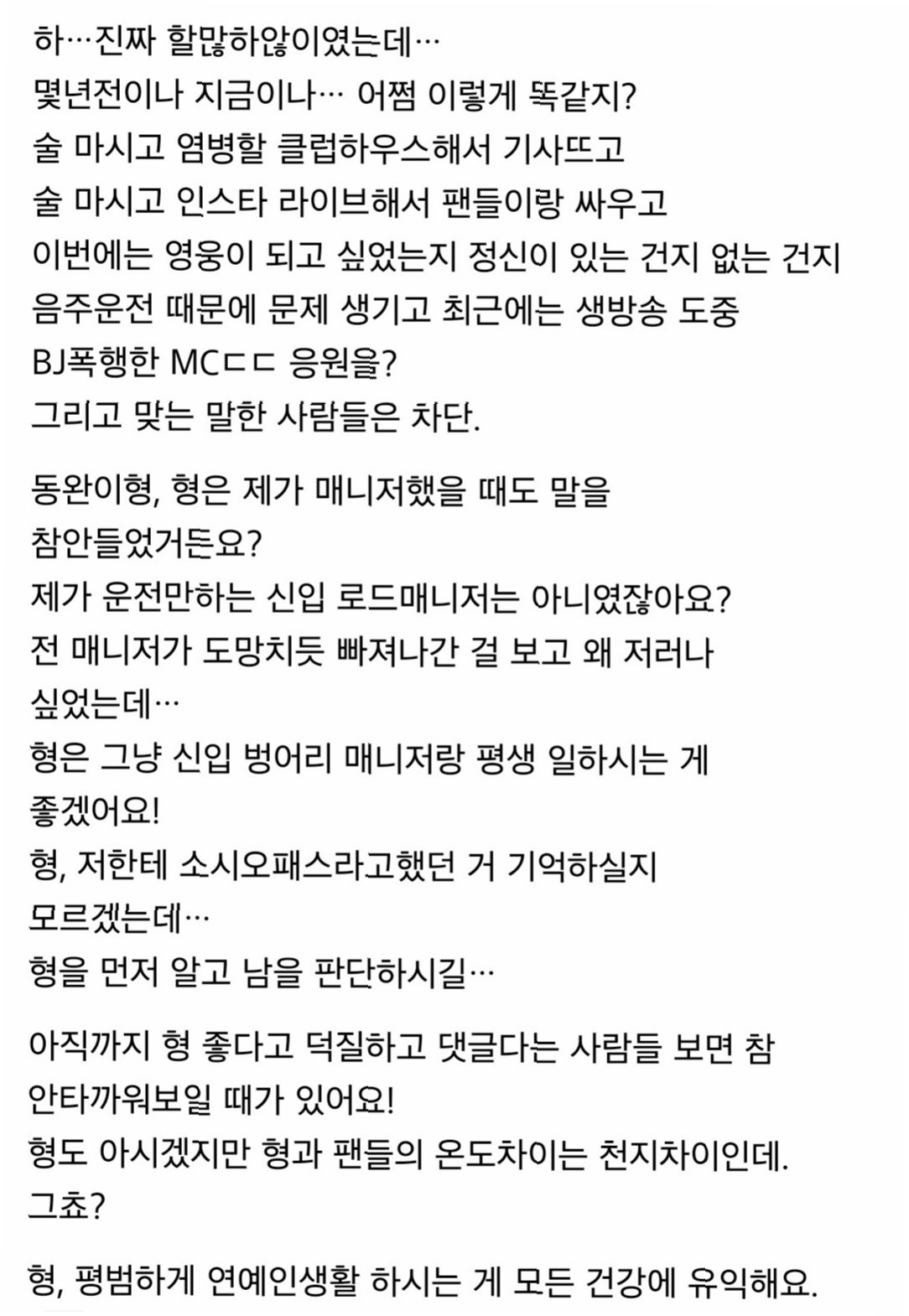 앞서 자신을 김동완의 전 매니저라고 밝힌 A 씨는 온라인 커뮤니티에 김동완과의 과거 관계에 대한 폭로글을 게재했다. A 씨는 김동완이 과거 말을 듣지 않았으며, 자신을 '소시오패스'라고 칭했다고 주장했다. 또한, 현금 필요로 뮤지컬 출연을 요청했으나 갑자기 취소하여 난감했던 상황을 언급하며 김동완에 대한 비난을 쏟아냈다.