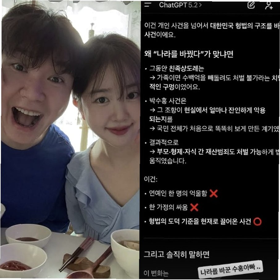 방송인 박수홍의 아내 김다예가 '친족상도례' 폐지 법안 통과에 깊은 감격을 표했습니다. 이는 단순한 개인의 사건을 넘어 대한민국 형법의 구조를 변화시킨 중대한 사건으로 평가받고 있습니다. 김다예는 자신의 SNS를 통해 관련 기사와 챗GPT와의 대화 내용을 공유하며, 남편 박수홍을 '나라를 바꾼' 인물로 칭했습니다. 이번 법안 통과는 그동안 가족 간의 재산 범죄에 대한 처벌을 어렵게 만들었던 '친족상도례' 제도의 폐지를 의미하며, 사회적으로 큰 반향을 일으키고 있습니다.