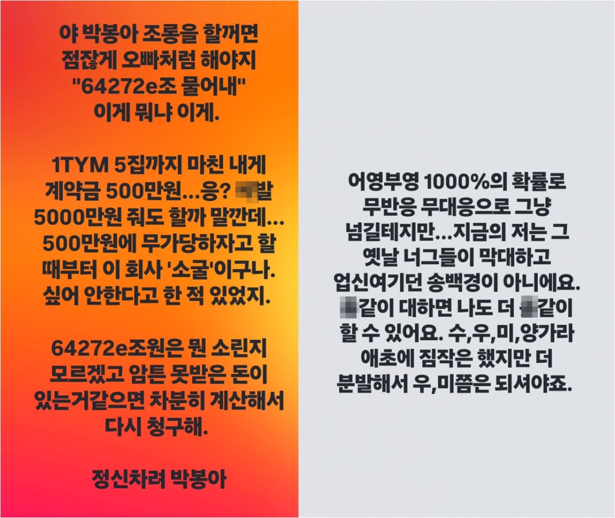 송백경은 박봄에게 '못 받은 돈이 있으면 차분히 계산해서 청구하라'는 조언과 함께, YG를 향해 강한 경고의 메시지를 보냈다. 그는 YG 관련 인물들과의 관계를 정리하고, 더 이상 그들과 엮이고 싶지 않다는 의사를 분명히 했다. 송백경은 과거 YG의 행태를 비판하며, 현재의 YG가 더욱 발전해야 함을 강조했다. 그의 이러한 발언은 YG를 향한 비판적인 여론을 더욱 확산시키는 계기가 될 것으로 보인다.