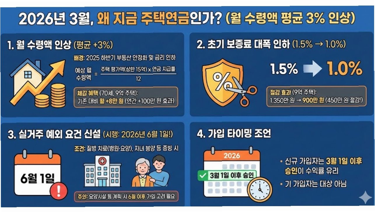 3월부터 주택연금 월 수령액이 최대 3.13% 인상되고, 실거주 의무 완화 및 우대형 주택연금 지원 확대 등 혜택이 강화됩니다. 은퇴 후 안정적인 소득 확보를 위한 주택연금, 더 많은 분들이 활용할 수 있게 되었습니다.