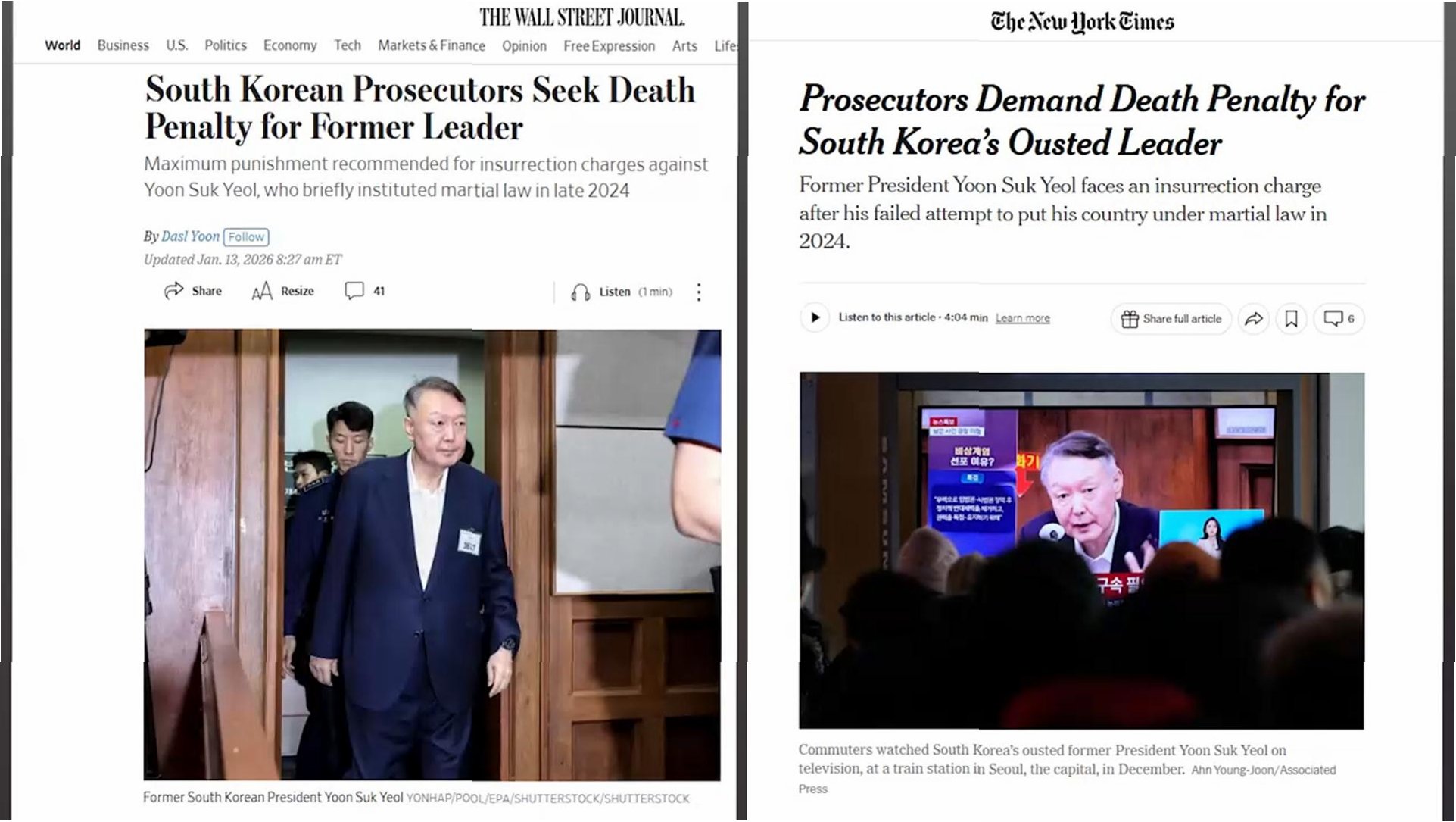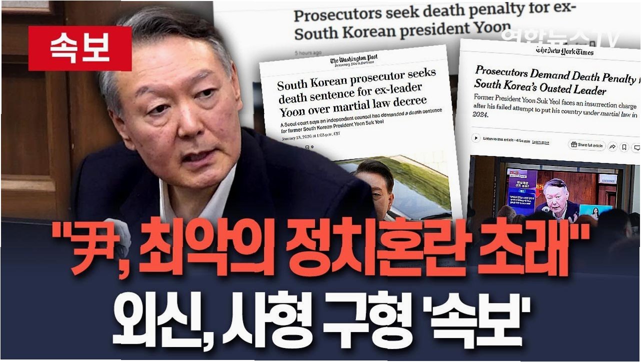 외신들이 일제히 윤석열 전 대통령에게 사형이 구형됐다는 소식을 긴급 타전했습니다. 뉴욕타임스는 “윤석열 전 대통령이 한국에 계엄령을 선포하려 했던 건 1980년대 이후 민주화를 이룩한 이후 최악의 정치적 위기를 초래했다”며 윤 전 대통령에게 검찰이 사형을 구형했다고 전했습니다.