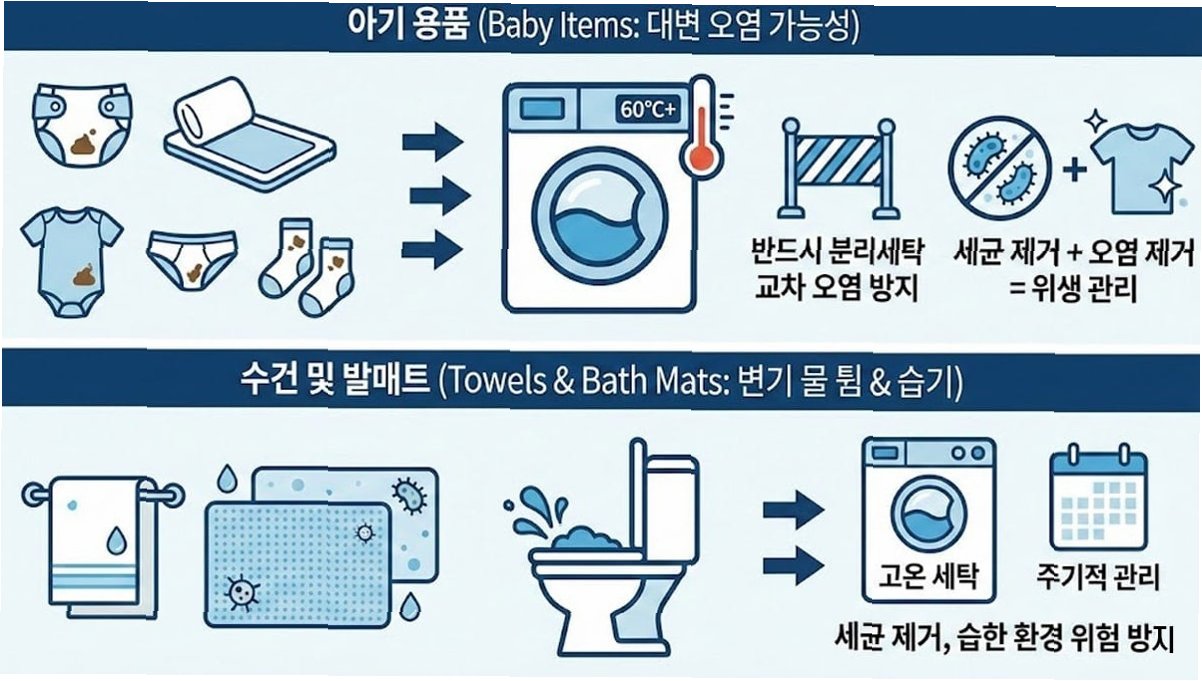 A.일반적인 의류는 찬물 세탁으로도 충분하지만, 세균 번식 위험이 높은 특정 품목(걸레, 수건, 아기 용품 등)은 고온 세탁이 필수적입니다.