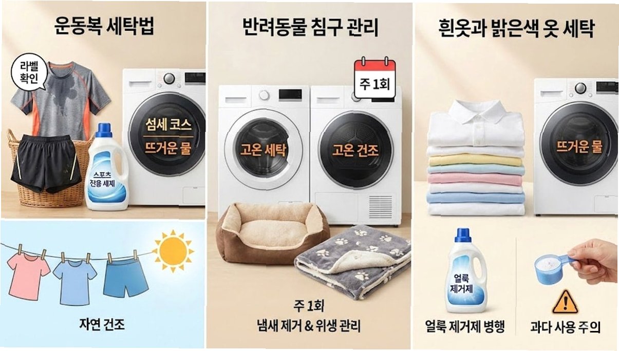 전기료 절약을 위해 찬물 세탁을 선호하지만, 걸레, 수건, 장바구니, 아기 용품, 운동복, 반려동물 침구 등 일부 품목은 세균 번식 위험이 높아 반드시 60도 이상의 온수로 세탁해야 합니다. 위생적인 생활을 위해 세탁물의 종류에 따른 적절한 세탁 온도 선택이 중요합니다.