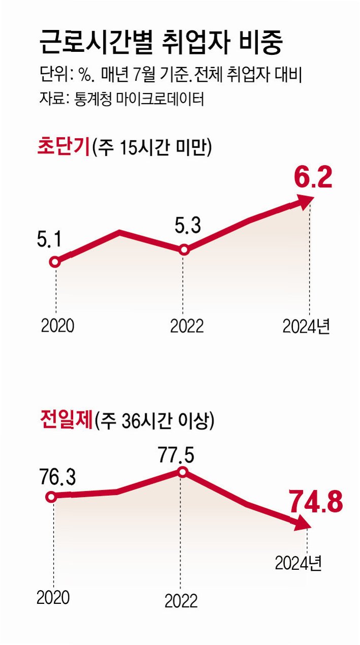 일자리는 있지만 소득이 낮은 ‘값싼 노동’이 확산되고 있다는 신호가 감지되고 있습니다. 올해 일주일에 15시간 미만 일하는 ‘초단시간 근로자’가 고령층을 중심으로 100만 명을 돌파했습니다. 2015년 29만6300명과 비교할 때 10년 만에 세 배 이상으로 증가했습니다. 김기홍 한국노동연구원 연구위원은 “일시적으로 발생하는 현상이 아니라 초단시간 근로자가 꾸준히 늘어나고 있다는 사실이 확인된 만큼 제도적 보완이 필요한 시점”이라고 말했습니다.