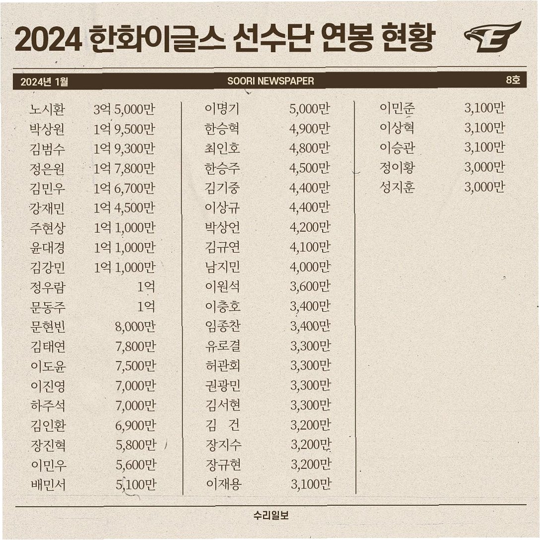 한화 이글스, 2024년 연봉 계약 마무리: 노시환, 팀 최고 연봉 등극!프로야구 한화 이글스가 2024년 연봉 재계약 대상자들과의 계약을 모두 마무리했습니다. 이번 계약을 통해 한화는 다가오는 시즌을 향한 기대감을 높이고 있습니다. 특히, 팀의 핵심 선수인 노시환 선수가 팀 내 최고 연봉을 받게 되면서 팬들의 관심이 더욱 뜨거워지고 있습니다. 이번 연봉 계약은 선수들의 노력과 팀 기여도를 공정하게 반영하여 이루어졌으며, 한화 이글스의 밝은 미래를 엿볼 수 있게 합니다. 노시환, 10억 원 연봉 계약! 장기 계약 대신 단년 계약 선택한화의 거포 노시환 선수가 10억 원의 연봉을 받는 조건으로 계약을 체결했습니다. 당초 노시환 선수와 한화 구단은 5년 150억 원 규모의 장기 계약을 논의했지만, 최종..